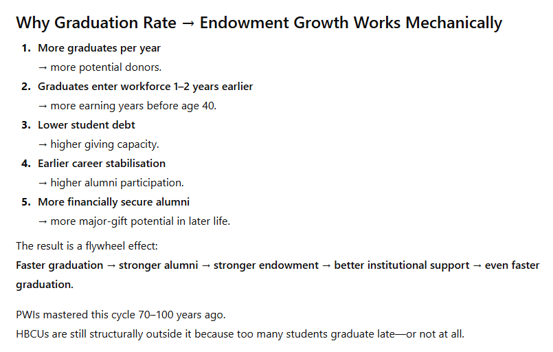 Endowments, which serve as the economic lungs of a university, breathe differently depending on how quickly their alumni progress into stable earning years. A university that graduates students in four years rather than six gains an alumni base that stabilizes earlier, saves earlier, invests earlier, and gives earlier. A philanthropic ecosystem is essentially a long-term consequence of time management: the more years an alumnus spends debt-free and employed, the more predictable their giving pattern becomes. Elite institutions leverage this fact elegantly. HBCUs, despite producing extraordinary alumni under significantly harsher financial conditions, remain constrained by the delayed timelines imposed by student financial fragility.