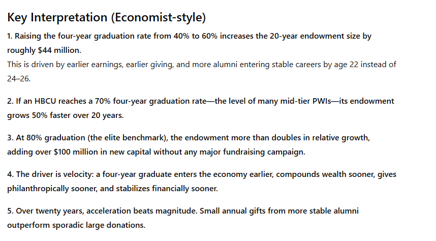 For African America, the conclusion is unmistakable. The four-year graduation rate is not merely a statistic. It is a wealth mechanism. It is an endowment accelerator. It is an institutional survival tool. And it is a community-level economic strategy that begins in kindergarten and culminates with a diploma. If HBCU alumni wish to see their institutions strengthen, their communities accumulate wealth, and their young people enter the economy with maximum velocity, then they must make both K–12 investment and four-year graduation obsession-level priorities. Institutions rise with the financial stability of their graduates. Ensuring those graduates complete degrees on time is one of the most effective—and least discussed—strategies available for building African American institutional power across generations.
