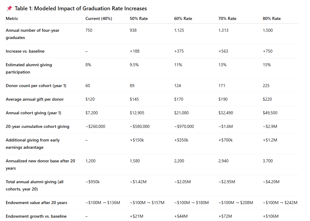 Assume that VSU today produces roughly 1,350 graduates every four years (based on a 27% rate). If it increased its four-year graduation rate to 50%, VSU would instead graduate 2,500 students every four years, an increase of 1,150 additional on-time graduates, each entering the workforce two years earlier, with lower student debt, earlier retirement contributions, earlier homeownership, and earlier philanthropic capacity. Even if only a modest fraction of these additional graduates contributed $50–$150 annually to VSU’s endowment, the compounding effect across 20 years would be substantial. Under conservative assumptions with basic donor participation growth and average returns of 7% VSU’s endowment could plausibly grow from $100 million to $155–$170 million over two decades, powered largely by the increased velocity and increased number of earning alumni.